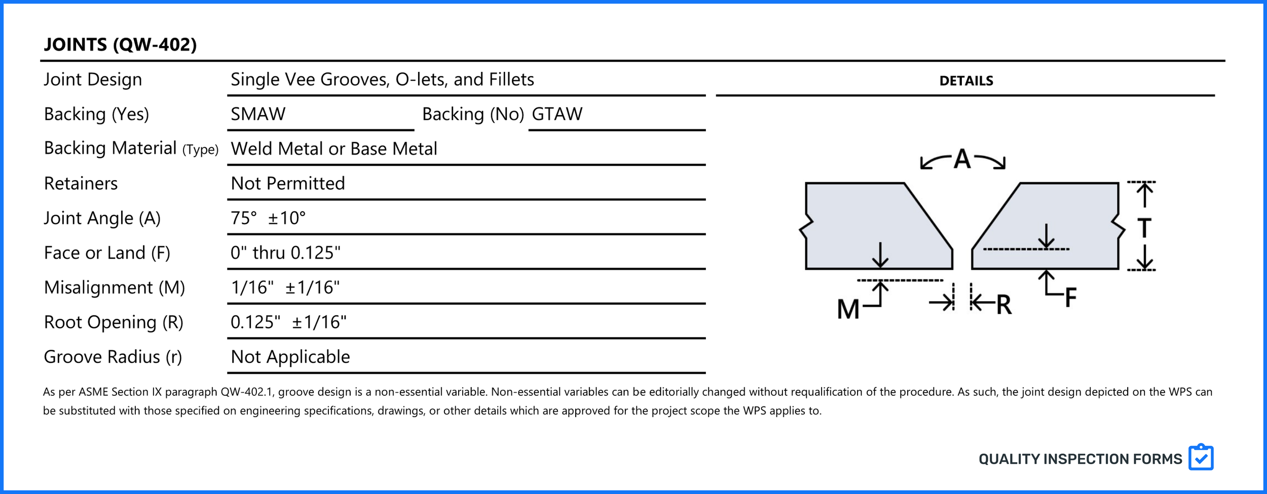 10 Sections of a WPS Mar 21 Written By Cassandra Painter ASME Section IX WPSQW-401 General QW-402 Joints QW-403 Base Metals QW-404 Filler Metals QW-405 Positions QW-406 Preheat QW-407 PWHT QW-408 Gas QW-409 Electrical Characteristics QW-410 Technique WPS Variable Table Summary Cassandra Painter